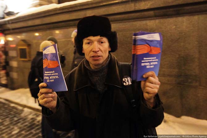 31 декабря, как обычно, на Триумфальной площади собрались правозащитники требовать соблюдения 31-ой статьи Конституции РФ. В отличие прошлогоднего, этот митинг был разрешён властями. Как и год назад, Людмила Алексеева пришла в костюме Снегурочки. Но и сам митинг, несмотря на разрешение, оставил впечатление дежа вю. Всё так же хватали и кидали в воронки организаторов и активистов, в том числе и члена бюро федерального политсовета Объединённого демократического движения "Солидарность" Бориса Немцова.